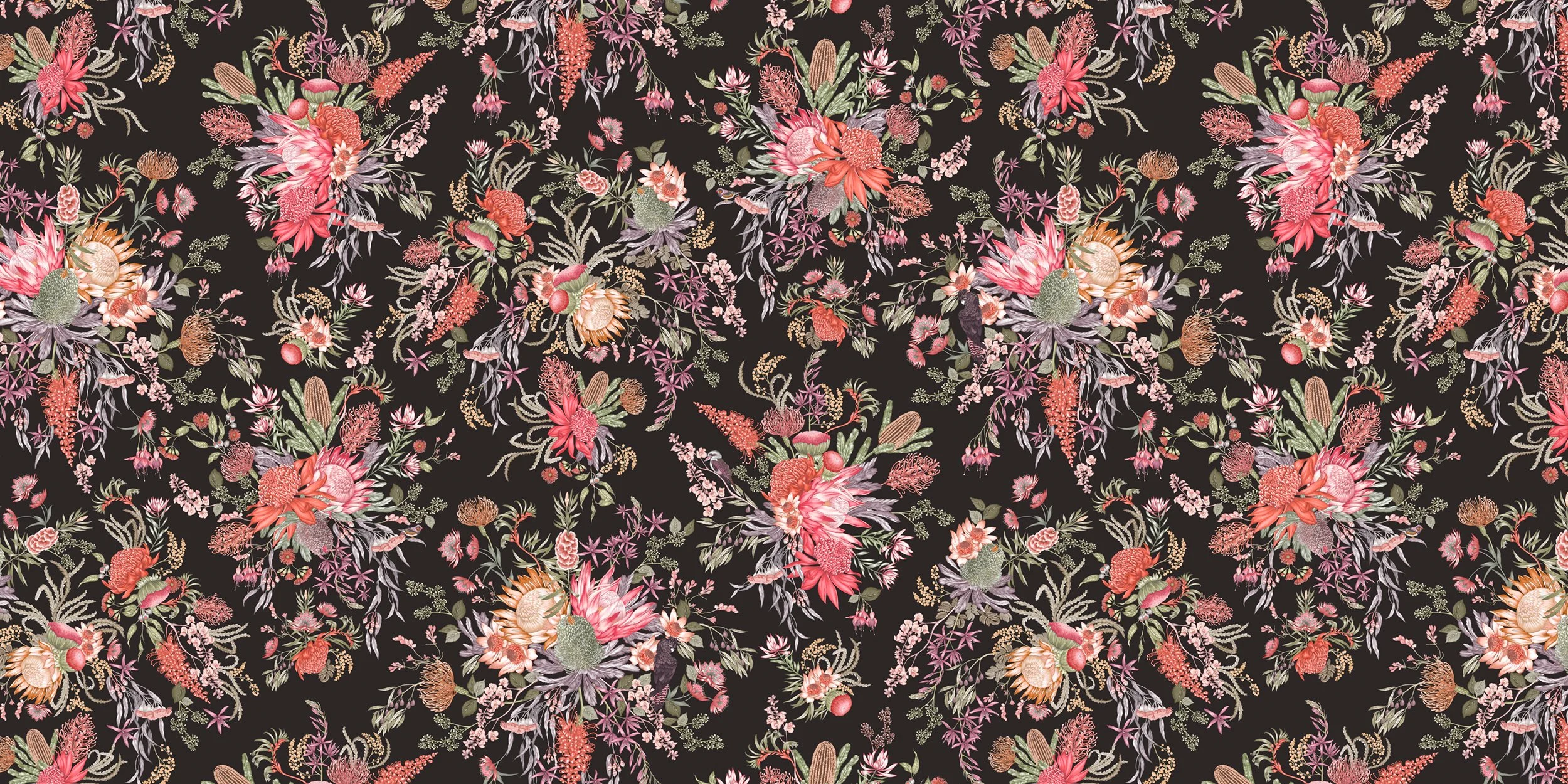 Australian Bloom is a hand-illustrated mural celebrating layered native florals in rich, immersive colour. Designed to envelop a space, it balances softness and depth, creating a refined statement wall for residential and boutique interiors.