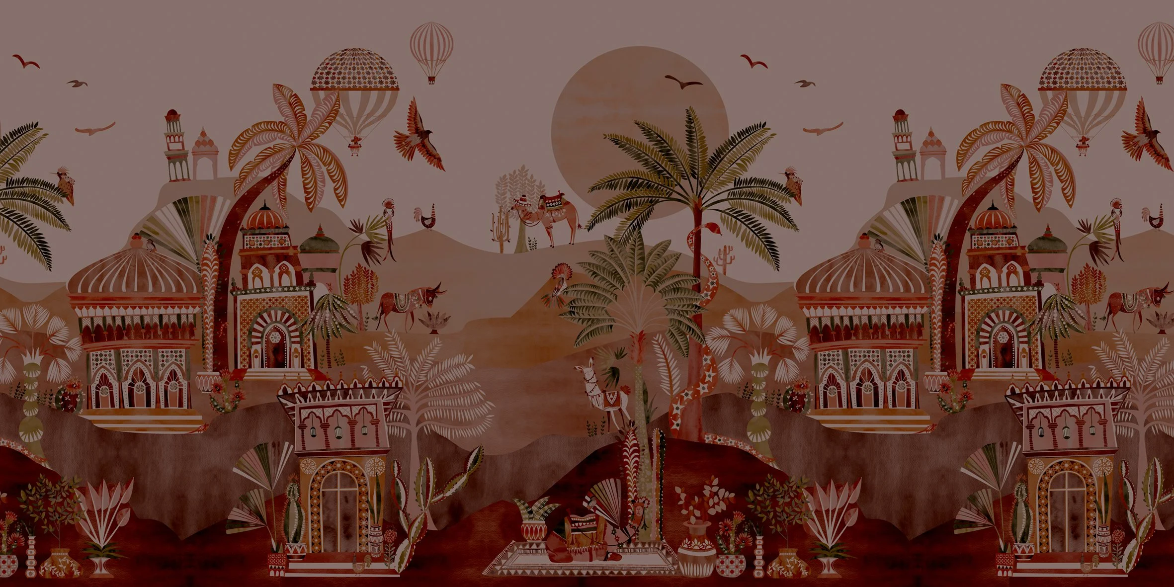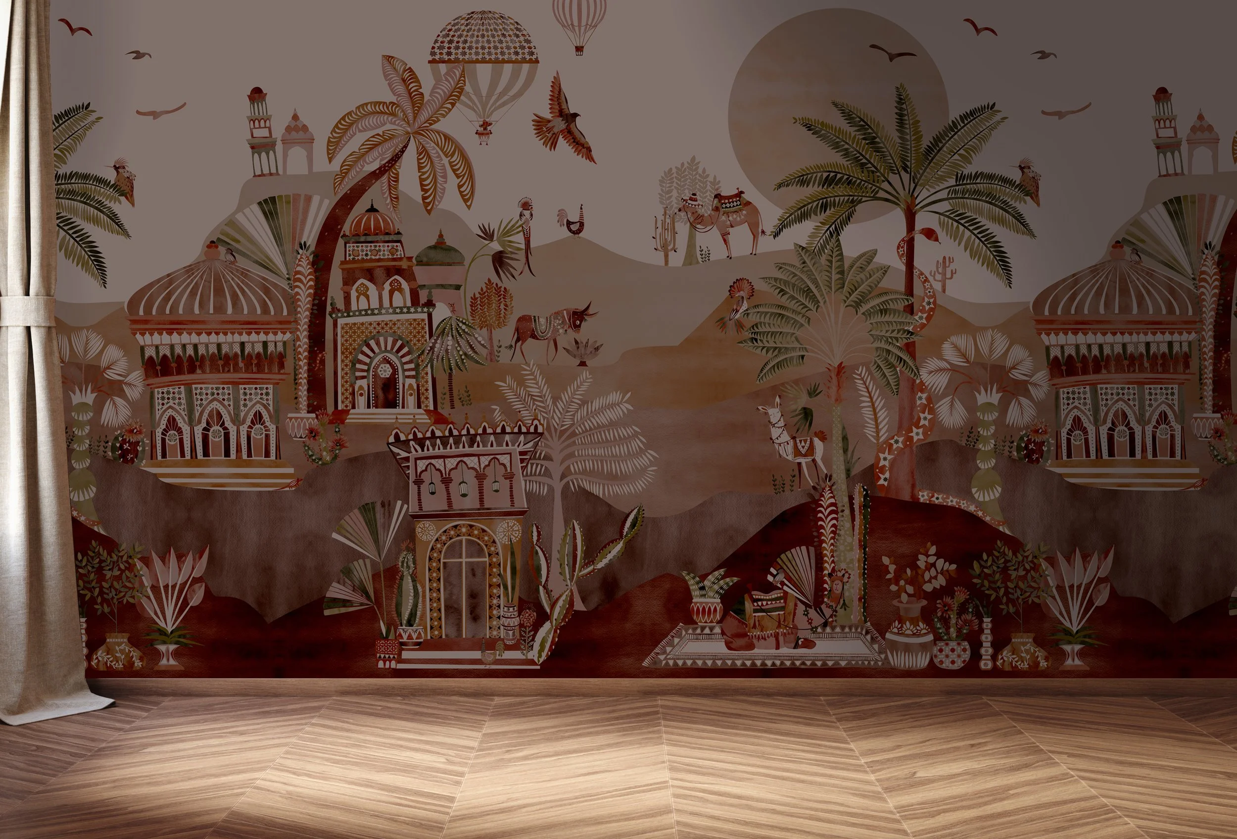 Inspired by the ornate architecture of the Middle East and the timeless beauty of Arabian desert landscapes, this mural evokes a sense of refined escapism and cultural elegance. Decorative domes, exotic palms and wandering wildlife unfold across a sun-washed backdrop, creating a richly layered visual narrative.